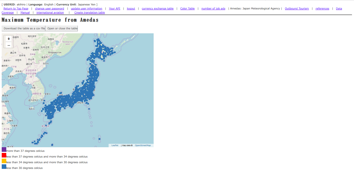 This page shows place names, maximum temperatures, and world grid square code at each observation point to be announced by the Japan Meteorological Agency. If you click [Download the table as a csv file], data can be retrieved as a CSV file. If you click [Open or close the table], the data table is displayed.