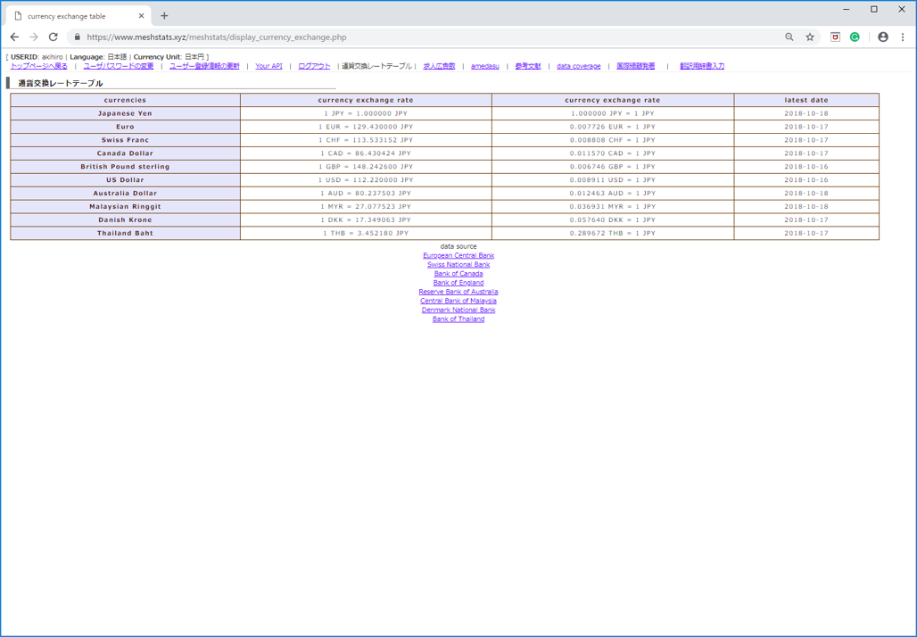 The exchange rate table displays the latest exchange rate published by central banks. Your selected currency unit is used as the base currency of the exchange rate table. The displayed exchange rate is mid-price between bid and offer exchange rates. By clicking on the clickable exchange rate, you can access historical exchange rates as the time series data.
