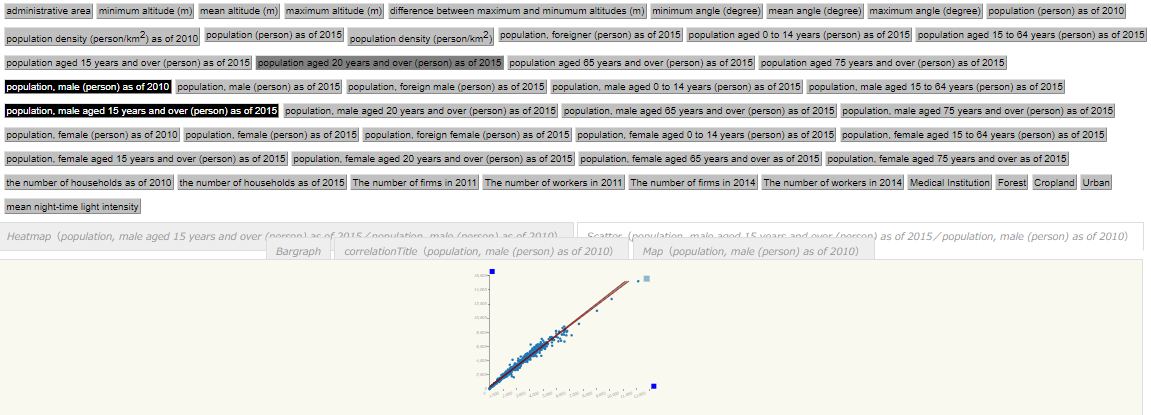 In the following figure, for example, the 2015 female population (population census) aged 0-14 and the 2010 cencus population have been chosen. Trends per world grid square for two types of selected data can be confirmed visually.