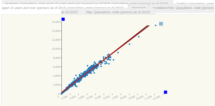 Use this function by selecting two types of world grid square statistics and data from the data list. Both Vertical axis and horizontal axis corresponds to two selected types of data. The number or quantity of selected data are plotted as a scatter graph. Logarithmic conversion of axis values is applied by clicking on a light-blue square on each axis. You can also click on a point in the scatter plot to identify world grid square. The extracted world grid square is displayed by a blue pin on the map and appears as all the feature values in the bargraph at the selected world grid square. The three lines illustrate the results of linear regression analysis. Two straight black lines are of OLS regression analysis which explains the y-axis by the x-axis and of OLS regression analysis which explains the x-axis by the y-axis. Parameter estimates of regression analysis are shown below the scatter plots. Statistical significance level of regression coefficients by t-test are displayed. The red line is of RMA regression analysis. The regression coefficients are also displayed at the bottom of the scatter plots. If you want to use it, select scatter from the tab. This function also can be used to detect outliers that tend to be out of place from other scatter plots for finding something interesting.