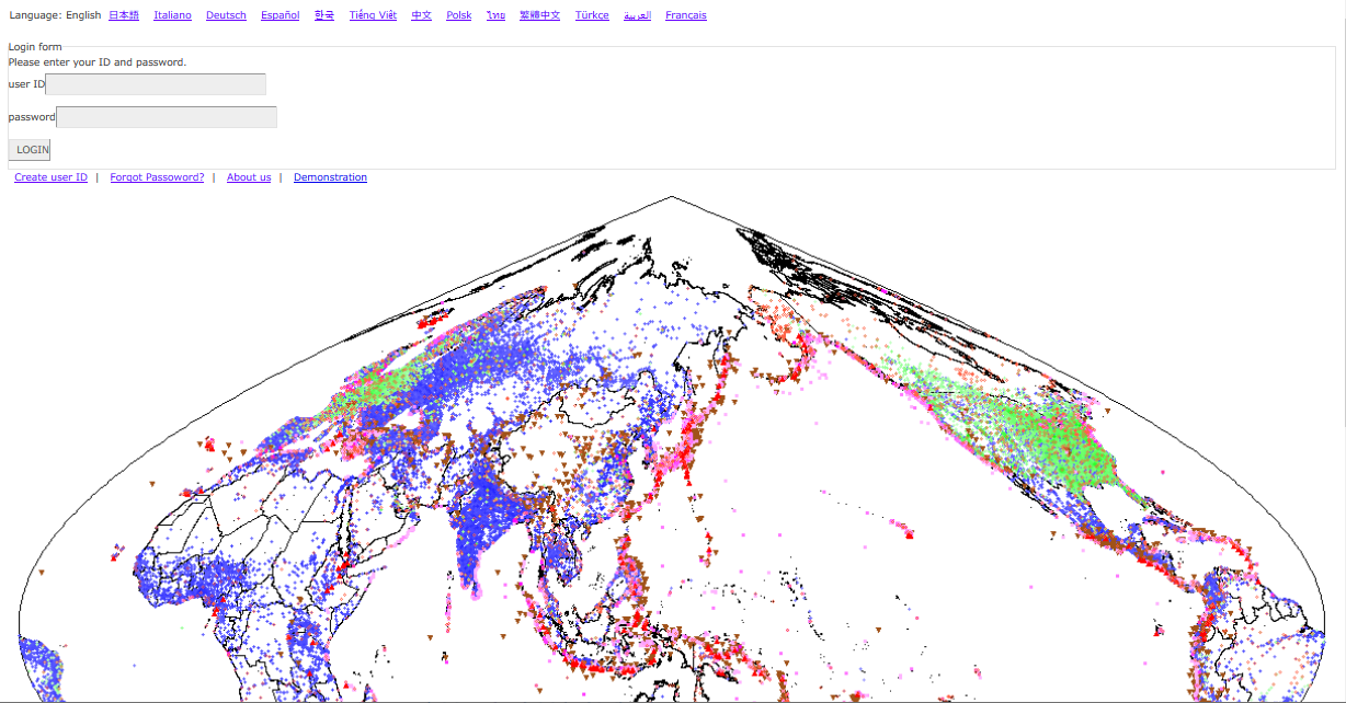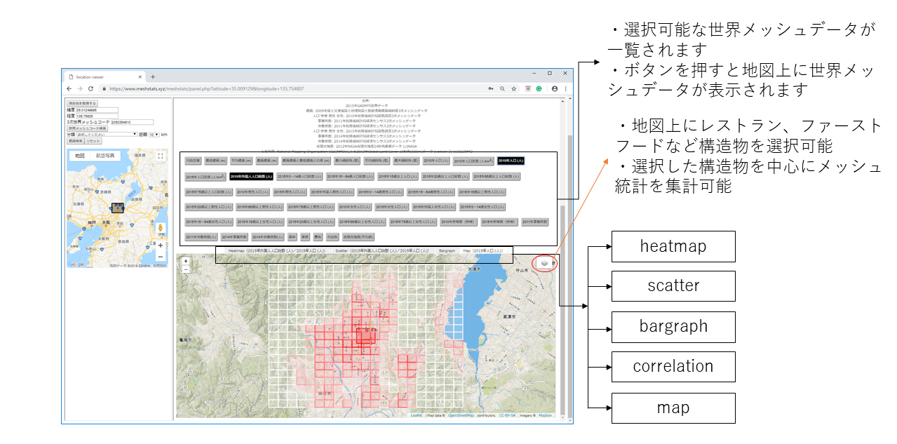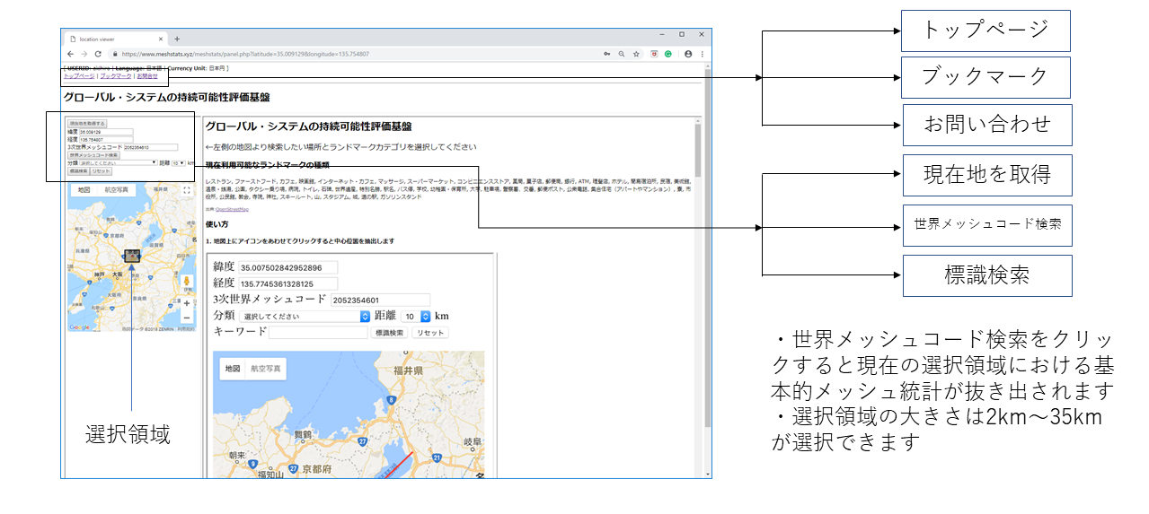 5. In Google Map, select an area on the map and set a type of target object from the categories. If you press [Search objects], then the search for landmarks you want to use will start and the landmarks appear on the map of the left hand side. Click on a landmark and a pop-up window including a clickable link appears on the map of the left hand side. If you click on the link, the data retrieving around landmarks will start. You will see the data and analysis software in the panel of the right hand side. If you click on [Search worldmesh Code] in both Google Map and ESRI maps, the data in the currently selected region begins to be retrieved from the database. Then, you will see the data and analysis software in the panel of the right hand side.
