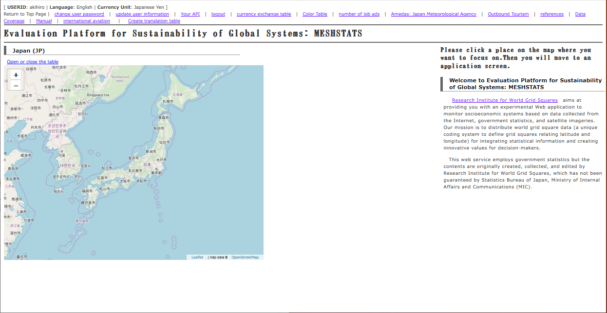 6. if you press the gray box to be displayed in the panel of the right hand side, world grid square statistics which you selected display on the map. This analysis type is called map. The system provides five types of analysis types such as heatmap, scatter, correlation, and bargraph. You can access various types of data and analysis functions. For more information, see How to use the data acquisition screen and Available functions.