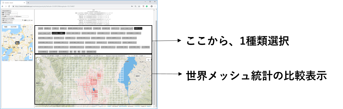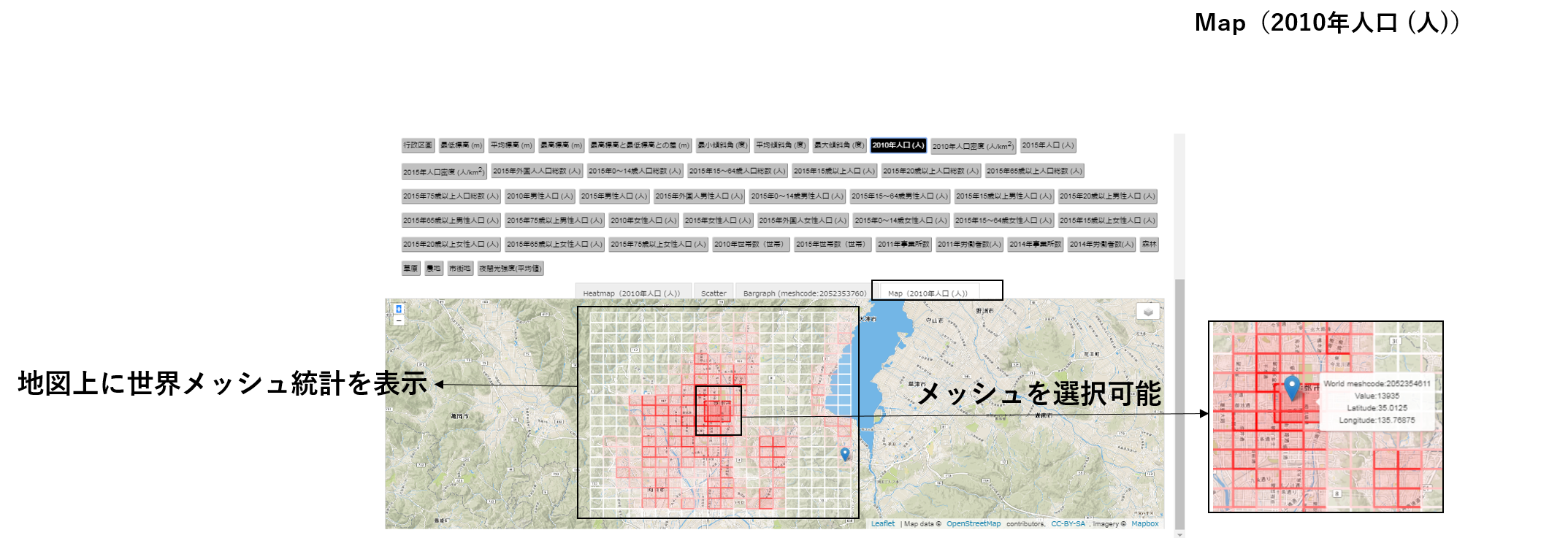 以下の図では、例として、2010年人口(人)を選択すれば地図上に世界メッシュ統計を表示でき、メッシュを選択すると詳細な値が表示されます。