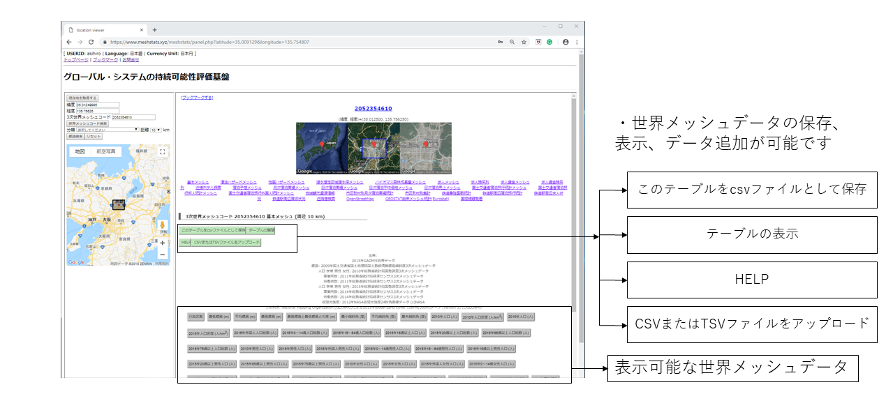 テーブル表示、作成した世界メッシュ統計データのアップロードによる追加が